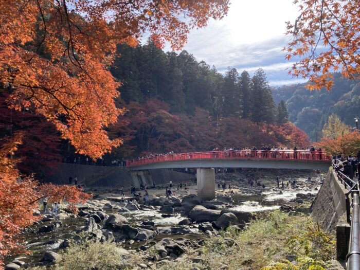確かに昨年より川岸からも山へグラデーションもみられもみじもきれいに色づいていました。昨年より時間も遅いこともあり出店がある付近は人が多く前に進めずゆっくり歩みそこを抜けるとある程度の人と人の間隔も空きゆっくり紅葉を楽しむことができました。