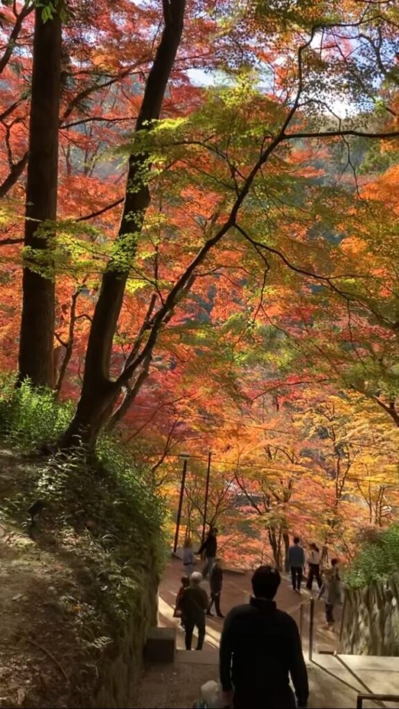 私の一押しの場所はもちろんあの朱色の橋「待月橋」から周りを一望するところもいいのですが「香積寺」の階段を昇ってその昇った階段上から振り返るとまるでトンネルのような美しい光景が広がります。私の一押しです。